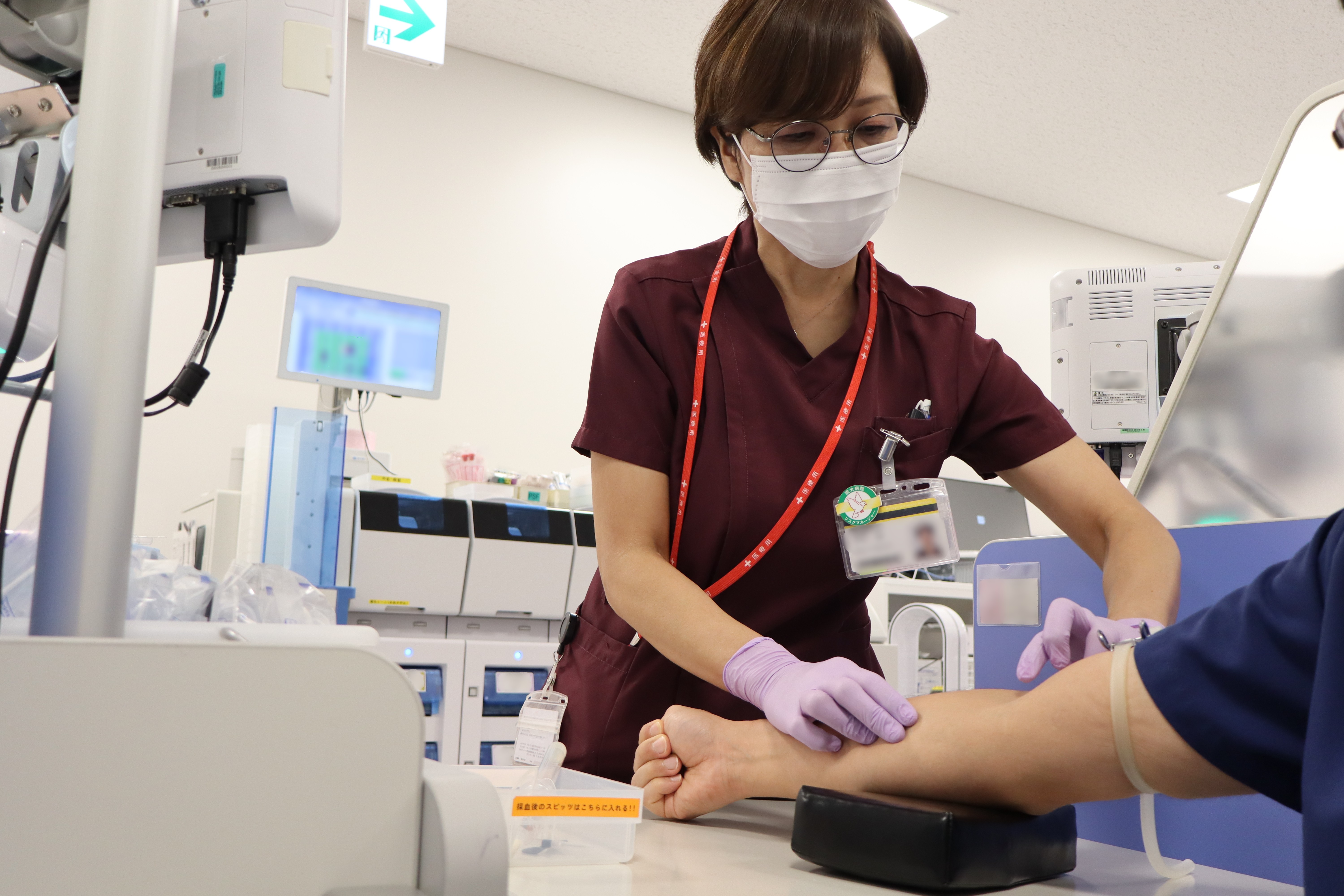 指導する立場となった今もなお、実務をおこなう山内さん(採血室にて)